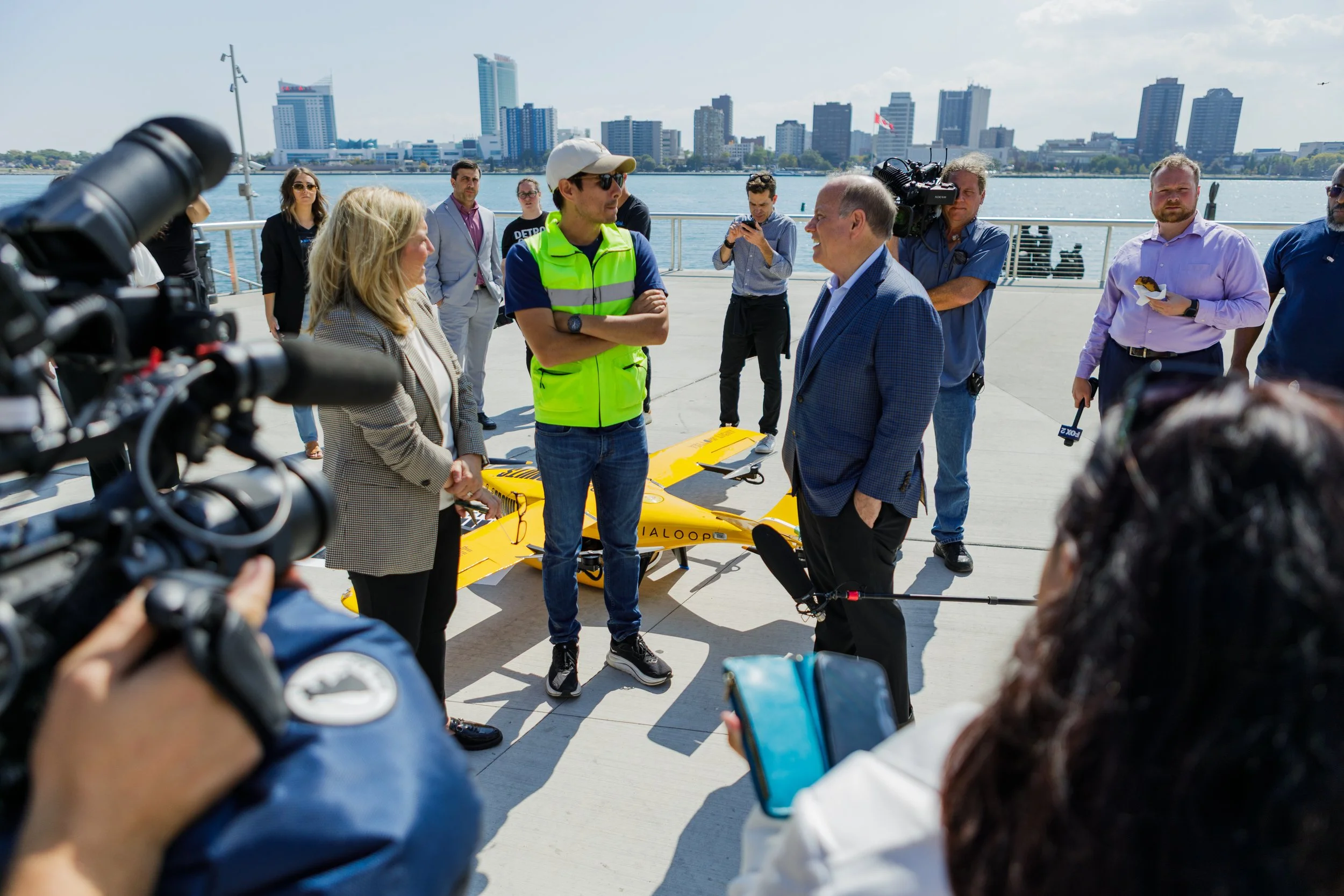 Launching from the roof of Newlab, we flew donuts across the city to construction workers at Ralph C. Wilson Park for their morning coffee break. Then we turned our attention to a VIP: the Mayor of Detroit, who received his own drone-delivered donut at Hart Plaza—marking the longest commercial drone flight in Michigan history.